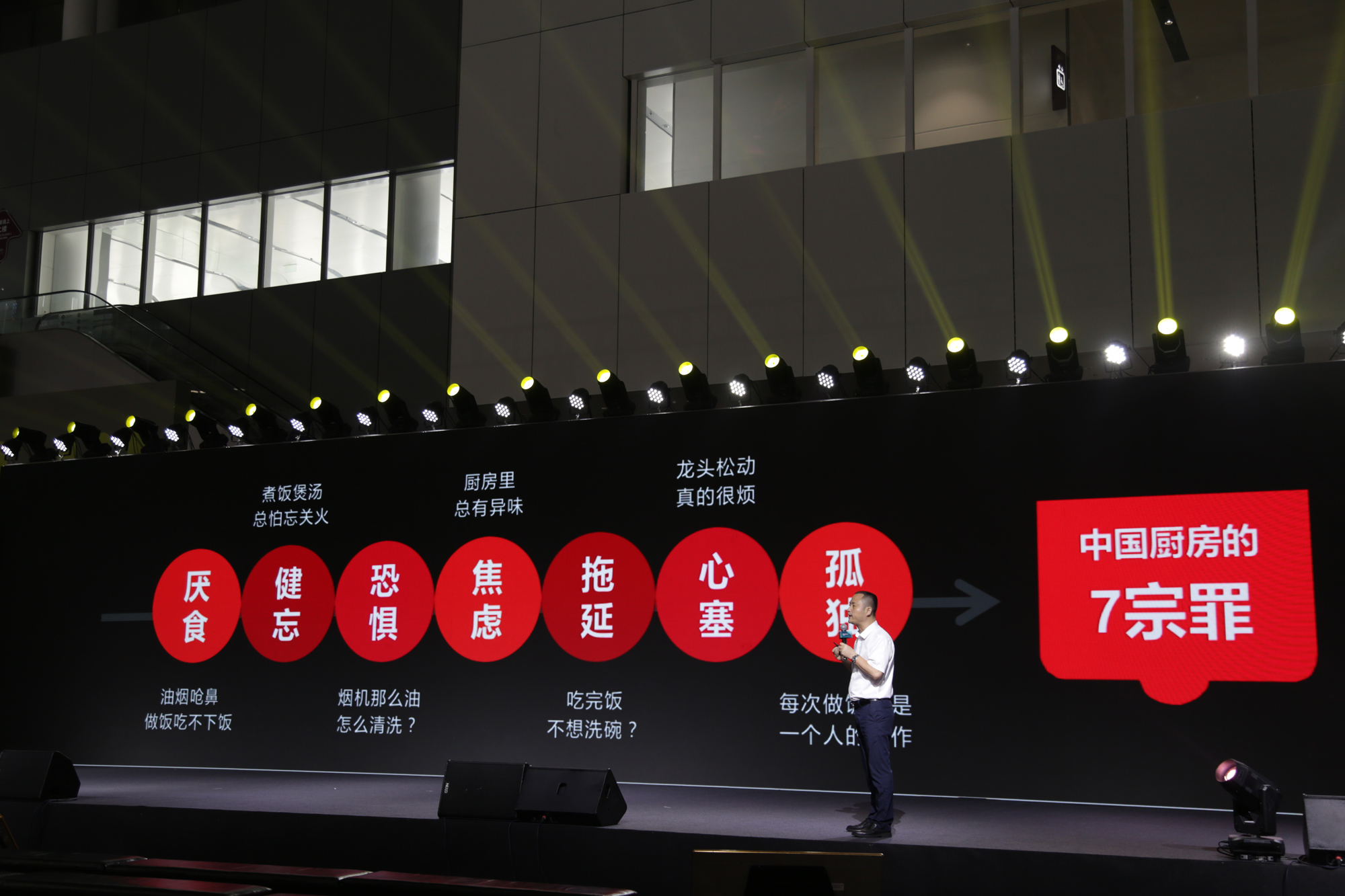 他提到目前中國廚房存在厭食、健忘、恐懼、焦慮、拖延、心塞及孤獨7大負面情緒,而這些問題主要源于不合適、不好用的產品體驗。